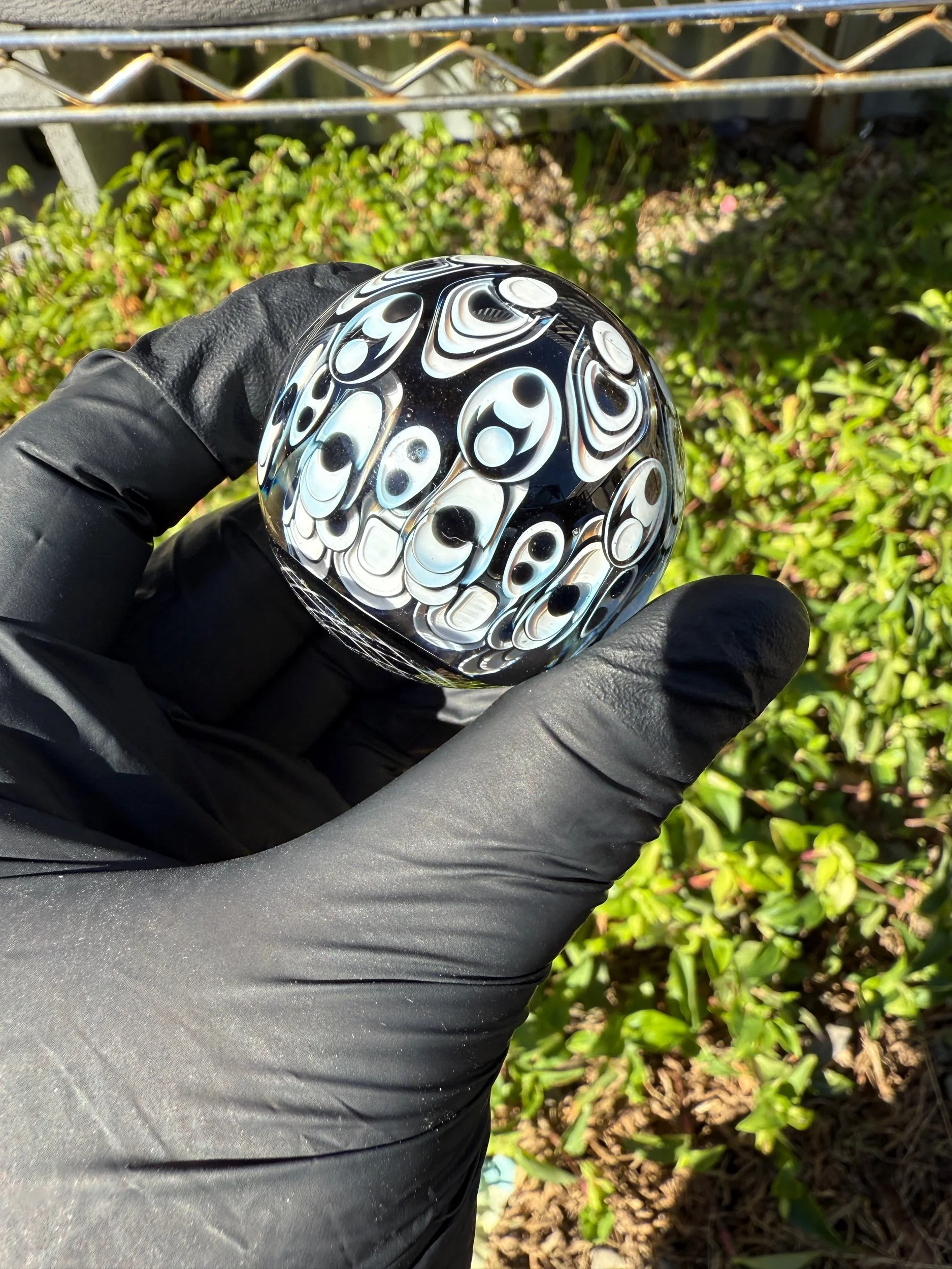 Large Opal coin wrapped in 3 layers of dot stacked pattern and another layer with a retticello adding another element to this large marble