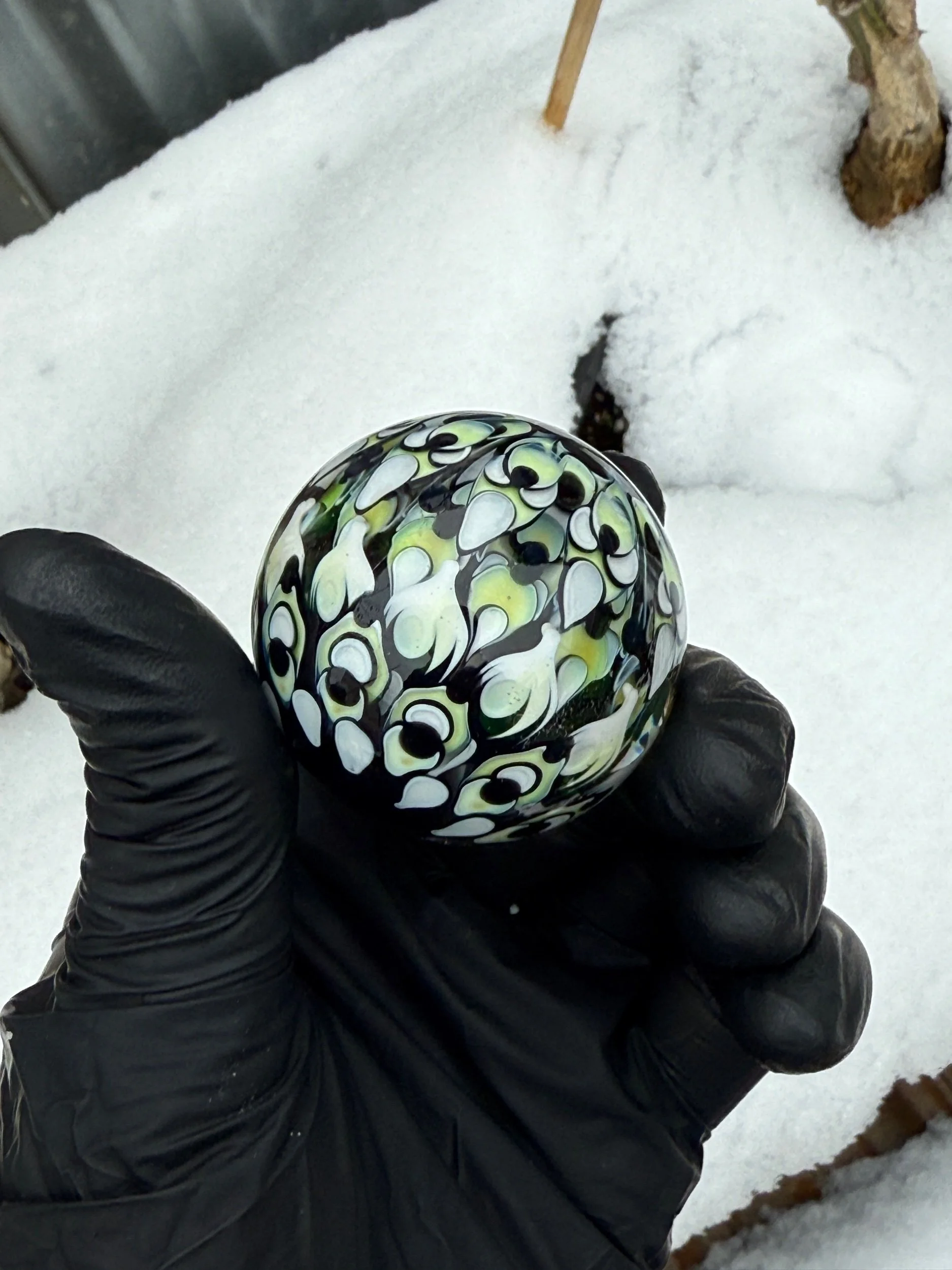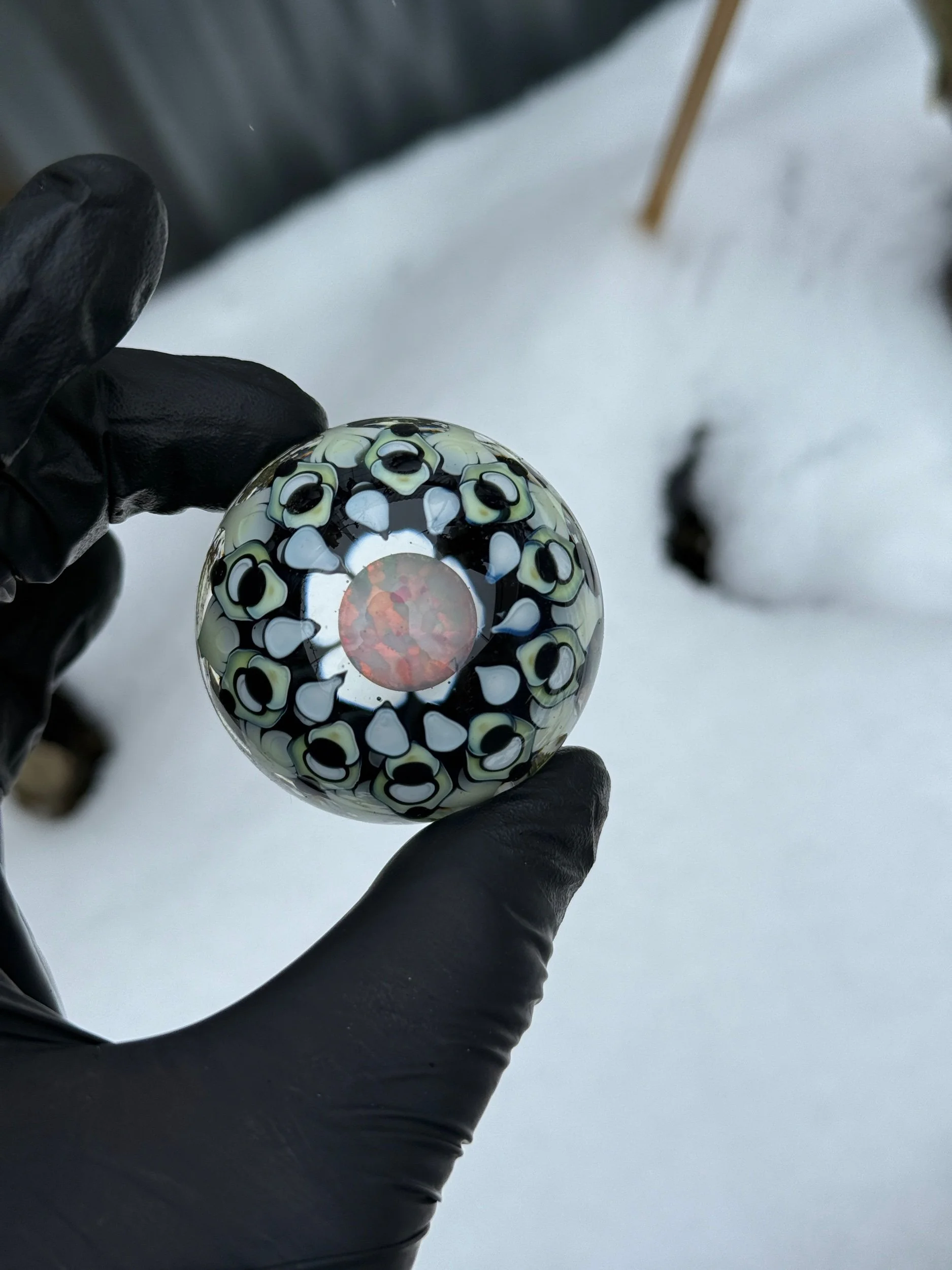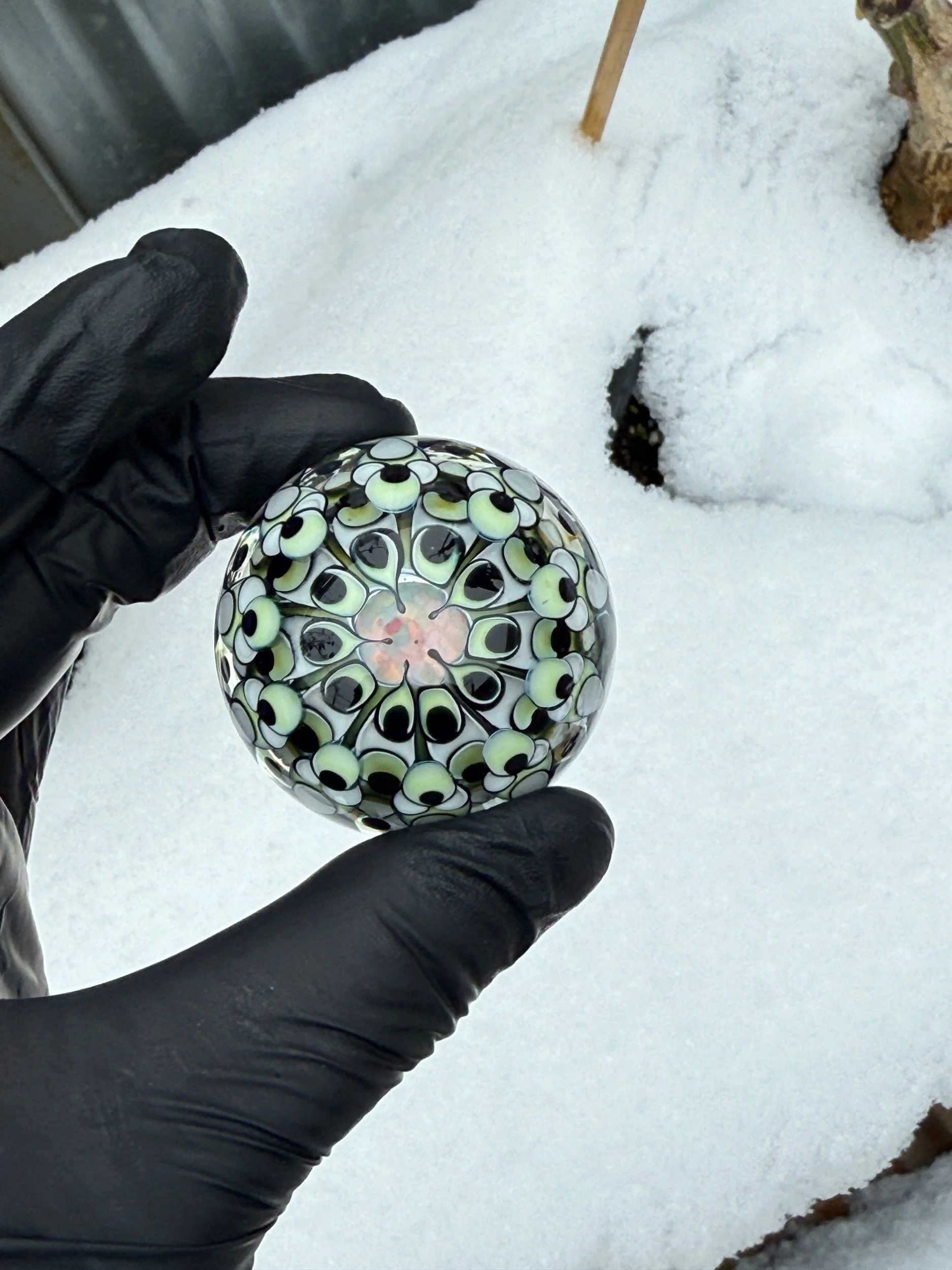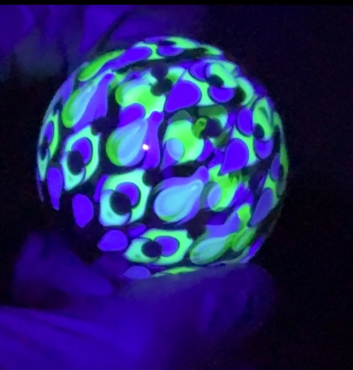 This marble features a large opal coin surrounded by 3 layer of intricate dot patterns some of which are only visible under a black light